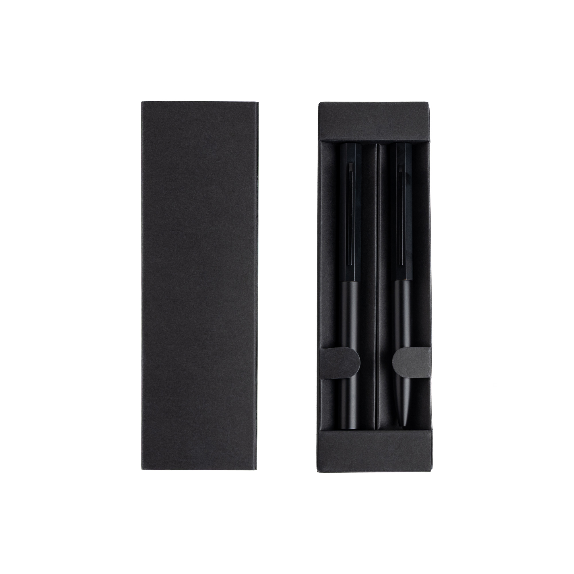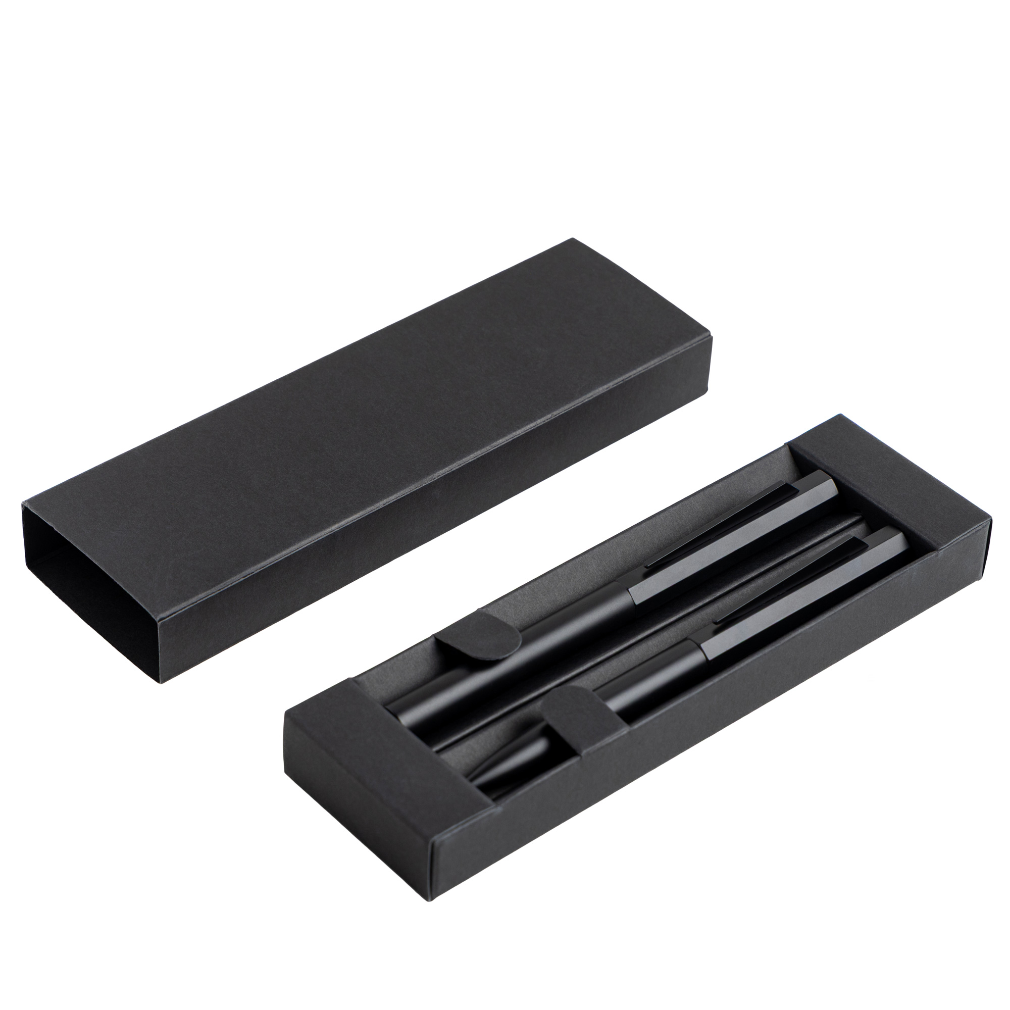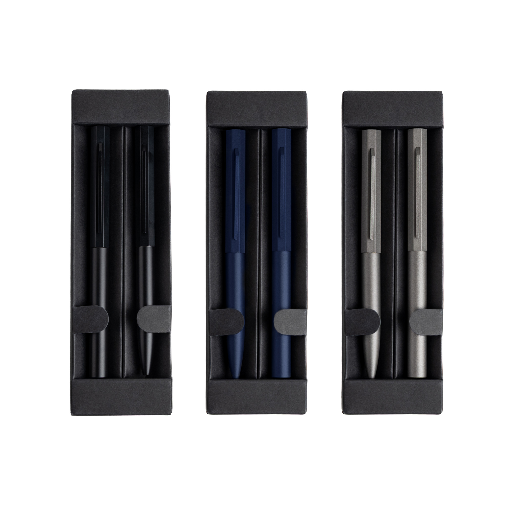 Elegancki zestaw składający się z długopisu i pióra typu roller, oba z matowym, metalicznym korpusem aluminiowym oraz charakterystycznym, ośmiokątnym detalem, który nadaje nowoczesnego i wyrafinowanego charakteru. Długopis wyposażony jest w mechanizm obrotowy, sześciokątną górną część oraz smukły metalowy klips o współczesnym designie. Zawiera wkład typu Parker, 1.0 mm, z czarnym tuszem. Pióro typu roller również posiada sześciokątną skuwkę i elegancki metalowy klips. Jego końcówka wykonana jest z matowego mosiądzu, a uchwyt i pierścień z matowego czarnego tworzywa, co zapewnia wygodę podczas pisania. Oba przybory zapakowane są w czarne, sztywne pudełko kartonowe. Wyrafinowany i praktyczny zestaw, idealny do codziennego użytku lub jako profesjonalny prezent.