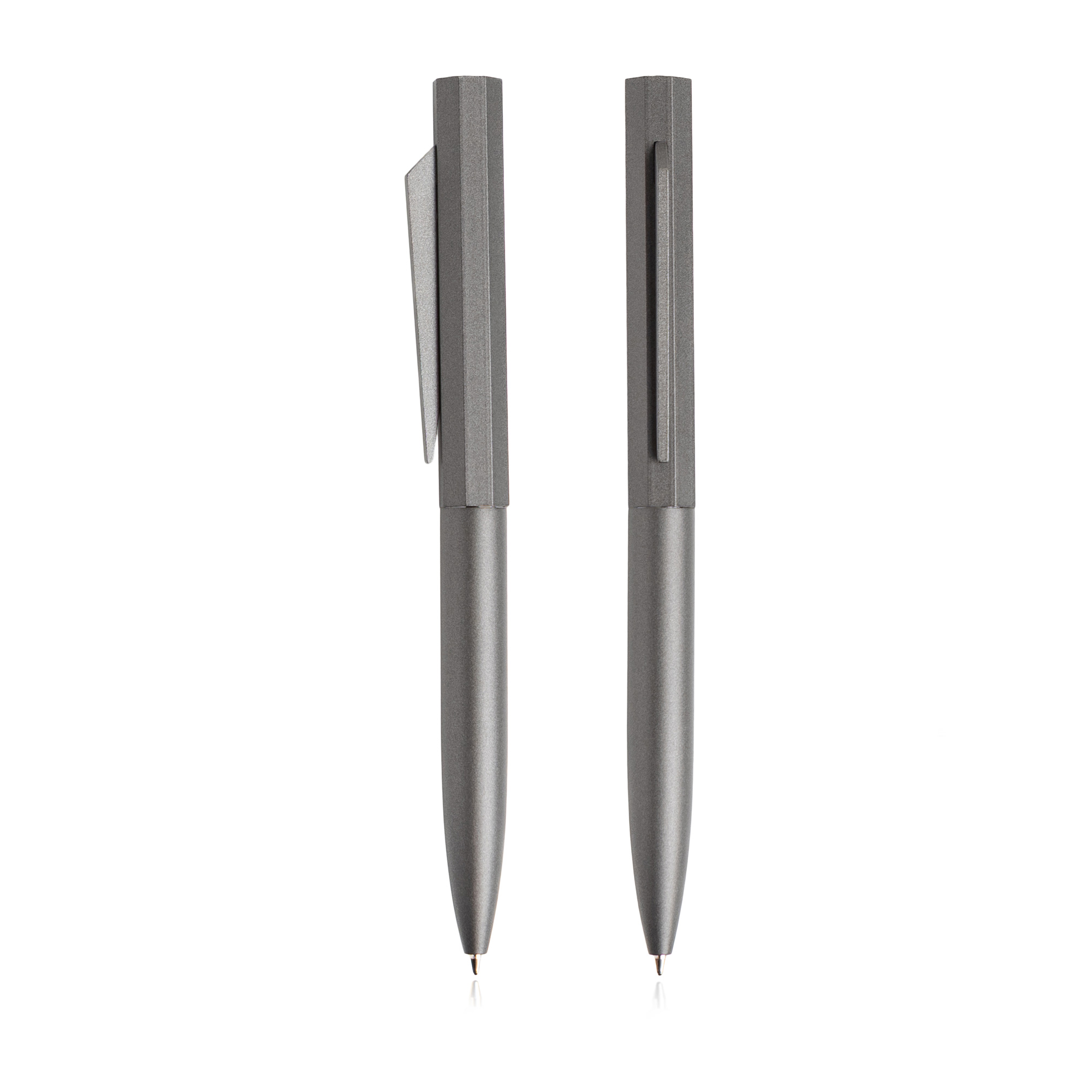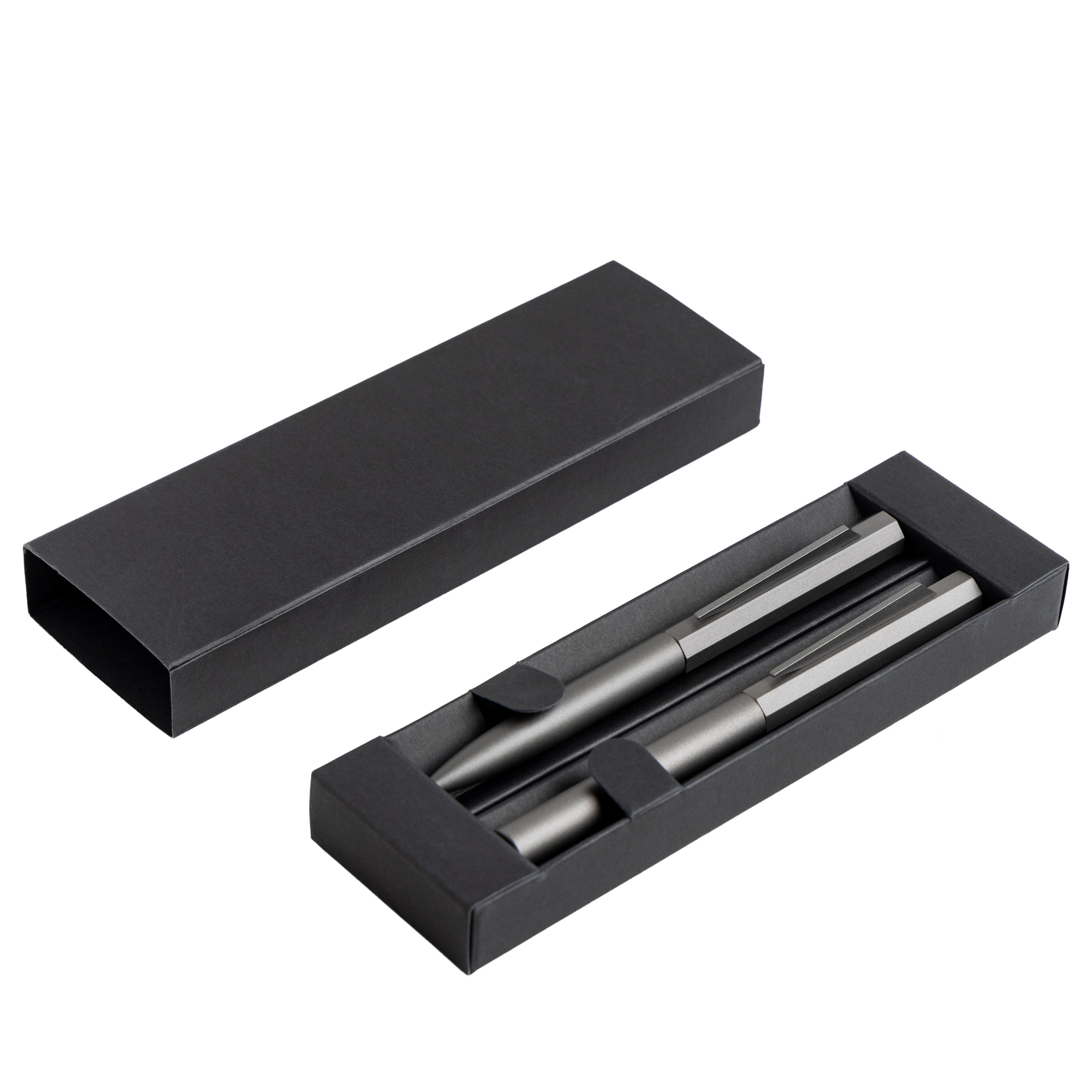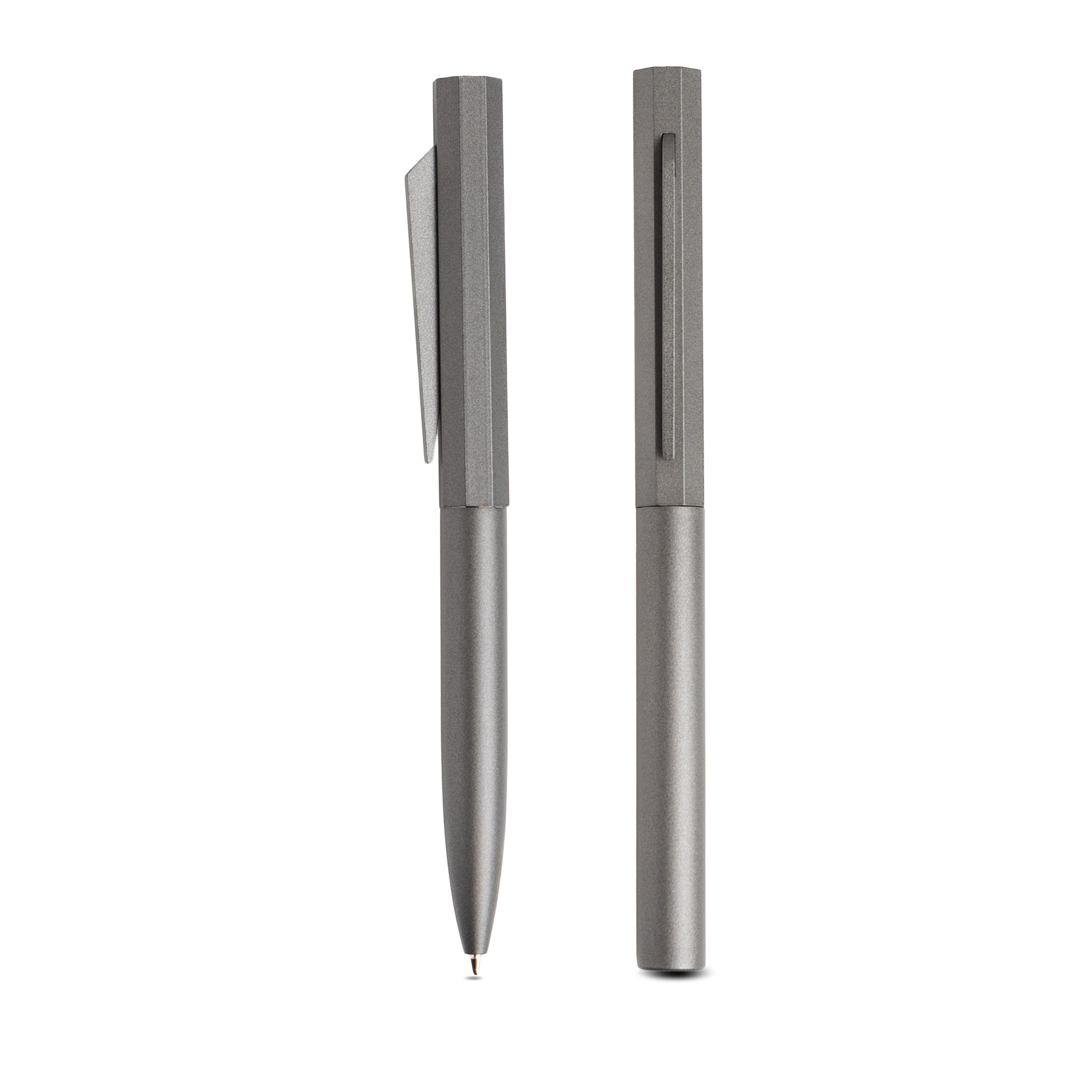 Elegancki zestaw składający się z długopisu i pióra typu roller, oba z matowym, metalicznym korpusem aluminiowym oraz charakterystycznym, ośmiokątnym detalem, który nadaje nowoczesnego i wyrafinowanego charakteru. Długopis wyposażony jest w mechanizm obrotowy, sześciokątną górną część oraz smukły metalowy klips o współczesnym designie. Zawiera wkład typu Parker, 1.0 mm, z czarnym tuszem. Pióro typu roller również posiada sześciokątną skuwkę i elegancki metalowy klips. Jego końcówka wykonana jest z matowego mosiądzu, a uchwyt i pierścień z matowego czarnego tworzywa, co zapewnia wygodę podczas pisania. Oba przybory zapakowane są w czarne, sztywne pudełko kartonowe. Wyrafinowany i praktyczny zestaw, idealny do codziennego użytku lub jako profesjonalny prezent.