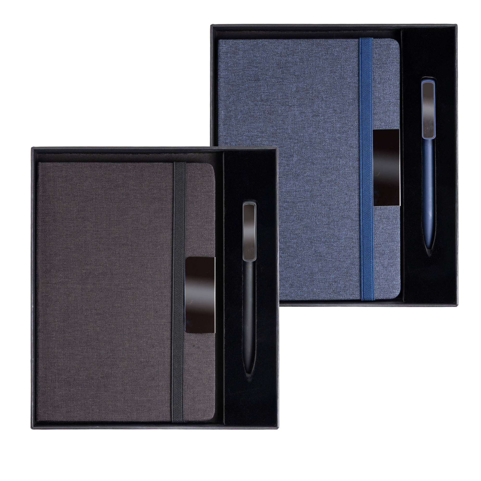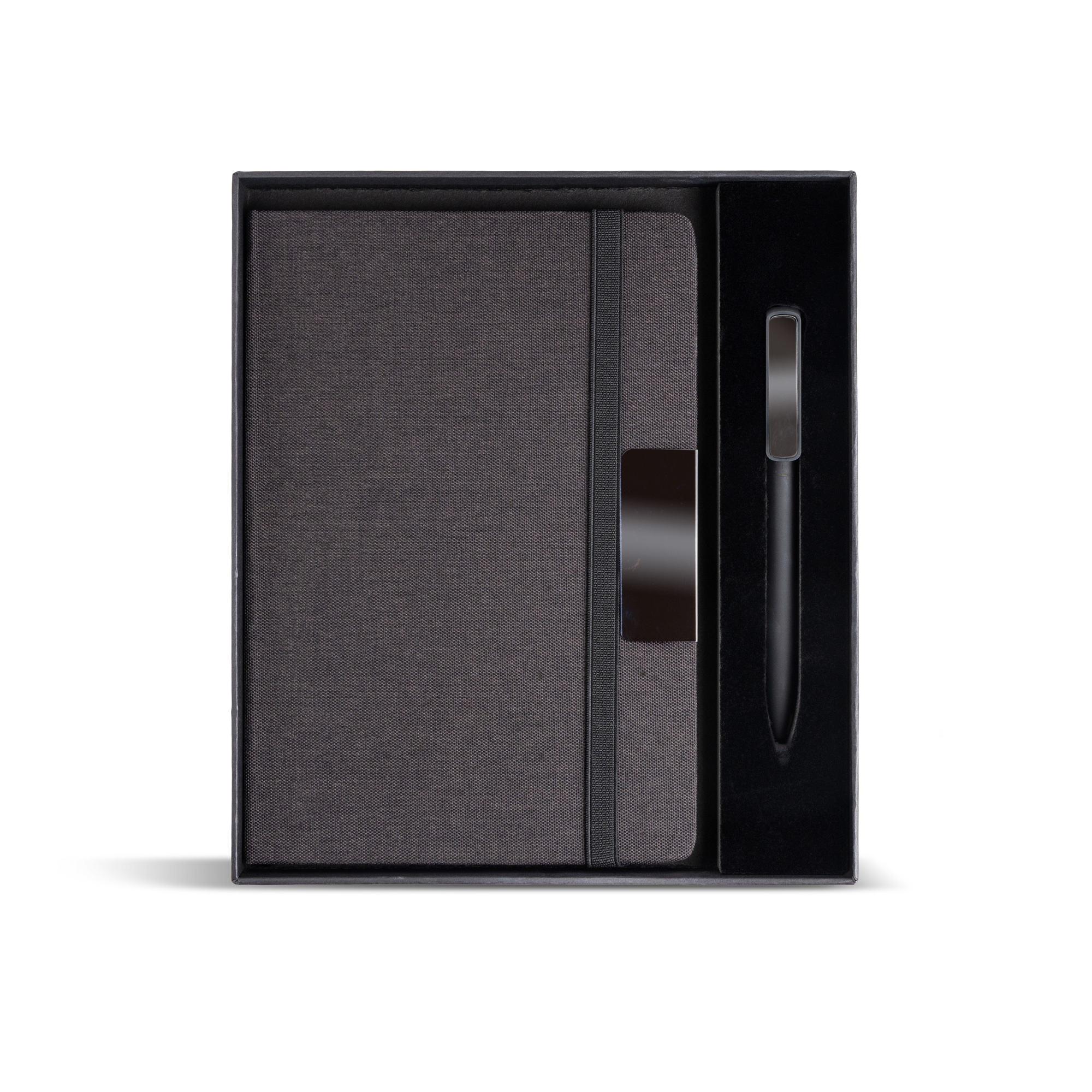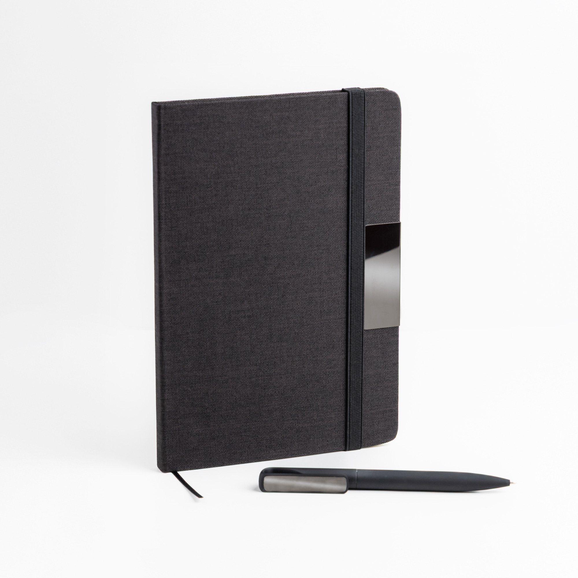 Notes A5 w twardej oprawie z tkaniny RPET, ozdobionej eleganckim metalowym detalem, idealnym pod grawer laserowy. Zawiera 160 stron gładkiego papieru o gramaturze 70 g, z certyfikatem FSC. Do zestawu dołączony jest aluminiowy długopis z gumowaną powłoką i lustrzanym klipsem, również przystosowany do graweru laserowego. Ten wyrafinowany komplet zaprezentowany jest w eleganckim czarnym pudełku z indywidualnymi przegródkami na każdy element.