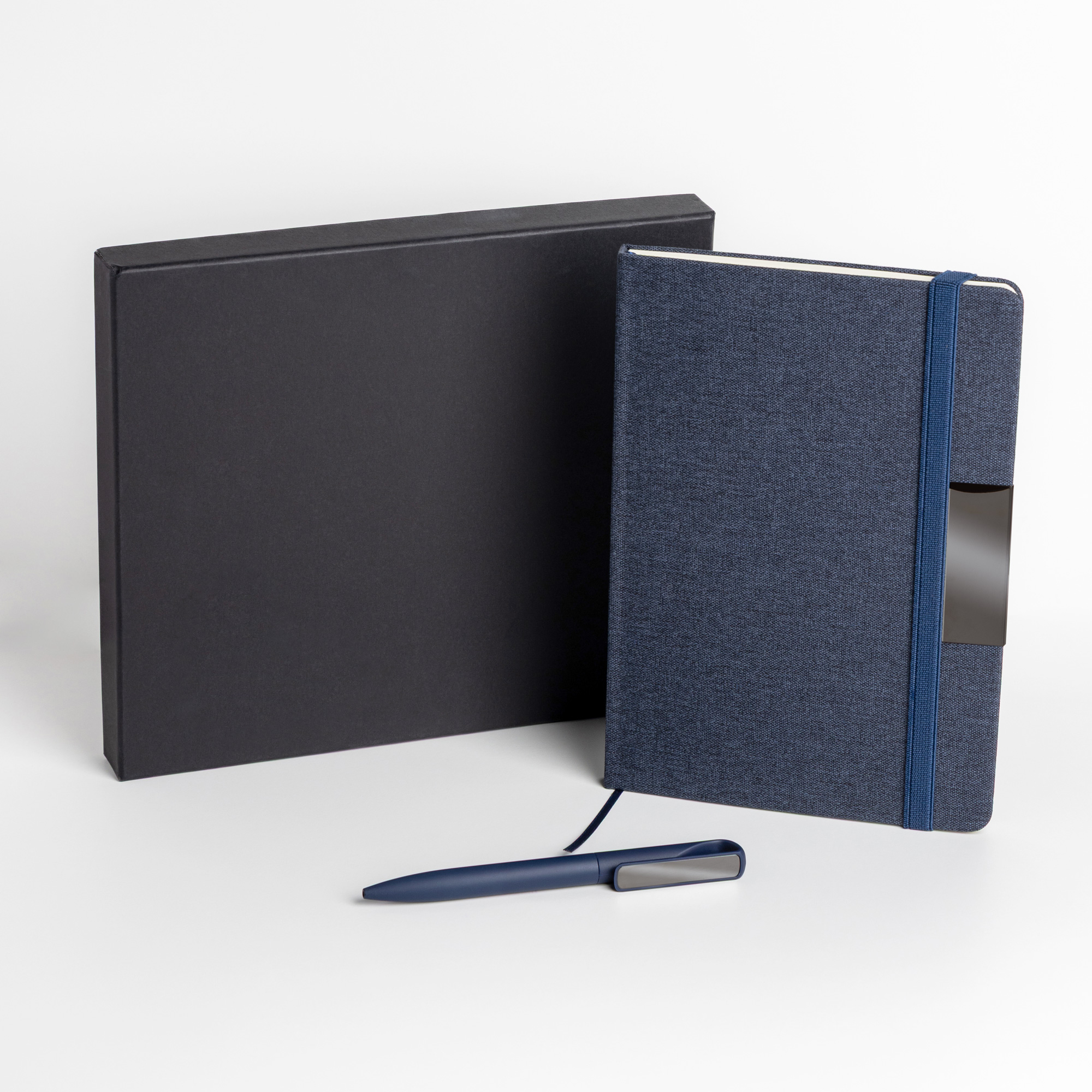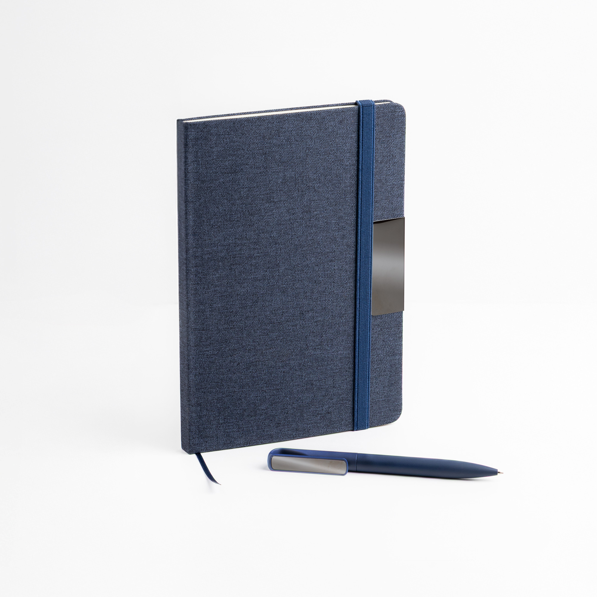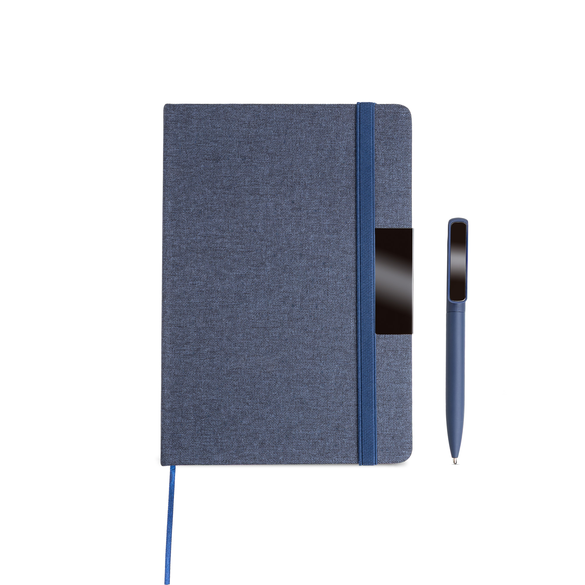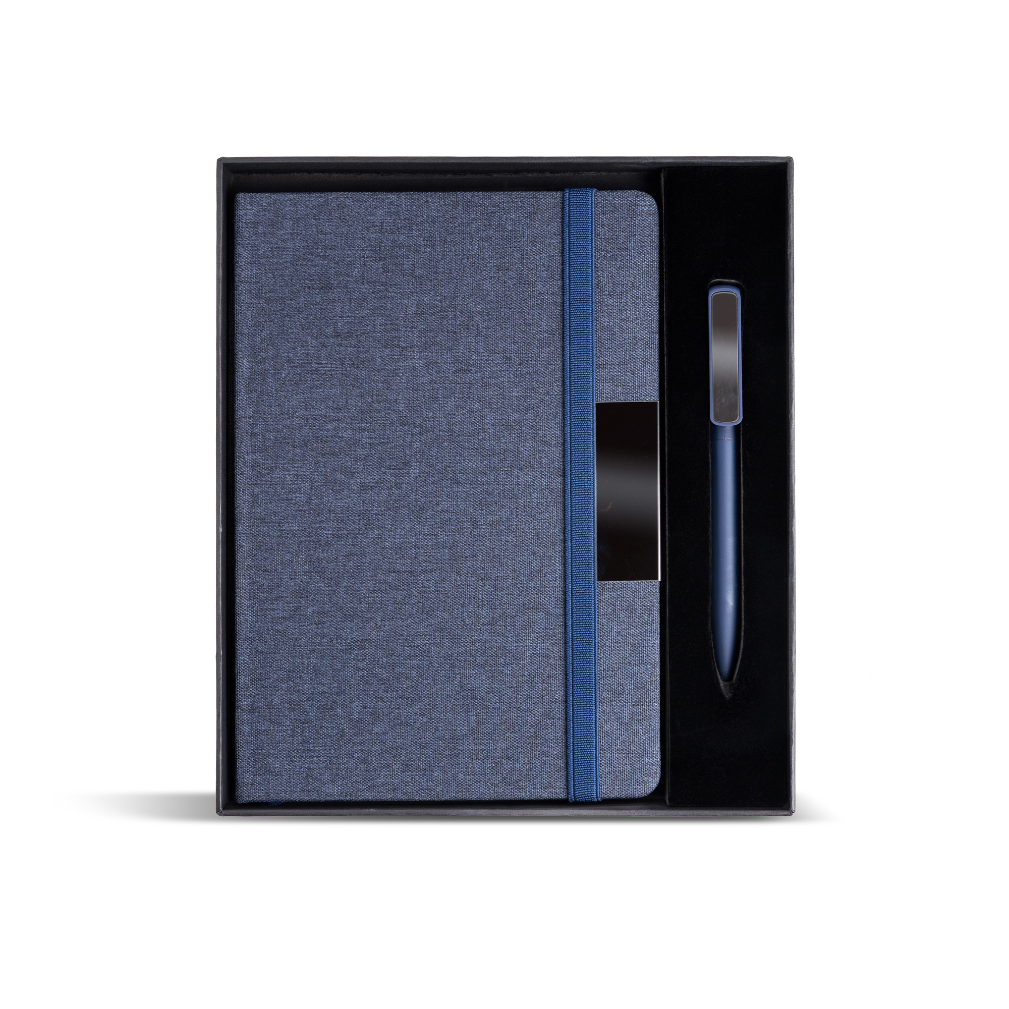 Notes A5 w twardej oprawie z tkaniny RPET, ozdobionej eleganckim metalowym detalem, idealnym pod grawer laserowy. Zawiera 160 stron gładkiego papieru o gramaturze 70 g, z certyfikatem FSC. Do zestawu dołączony jest aluminiowy długopis z gumowaną powłoką i lustrzanym klipsem, również przystosowany do graweru laserowego. Ten wyrafinowany komplet zaprezentowany jest w eleganckim czarnym pudełku z indywidualnymi przegródkami na każdy element.