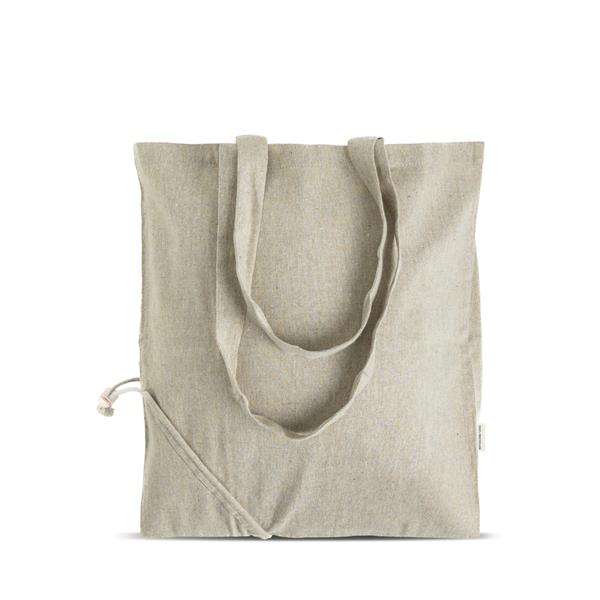 Składana torba z melange’owej bawełny z recyklingu o gramaturze 150 g/m². Wykonana z bawełny pochodzącej z recyklingu ścinków poprodukcyjnych (pre-consumer). Podczas produkcji odzieży niewielkie resztki materiałów są ponownie wykorzystywane do stworzenia nowego, trwałego surowca o naturalnie jasnym odcieniu. Dzięki przemyślanej konstrukcji torbę można łatwo złożyć do kompaktowych rozmiarów, idealnych do przechowywania w torebce, plecaku lub schowku samochodowym. Po rozłożeniu oferuje pojemną i solidną przestrzeń do codziennego użytku – to ekologiczne, wielorazowe rozwiązanie, które łączy funkcjonalność, lekkość i zrównoważone podejście.