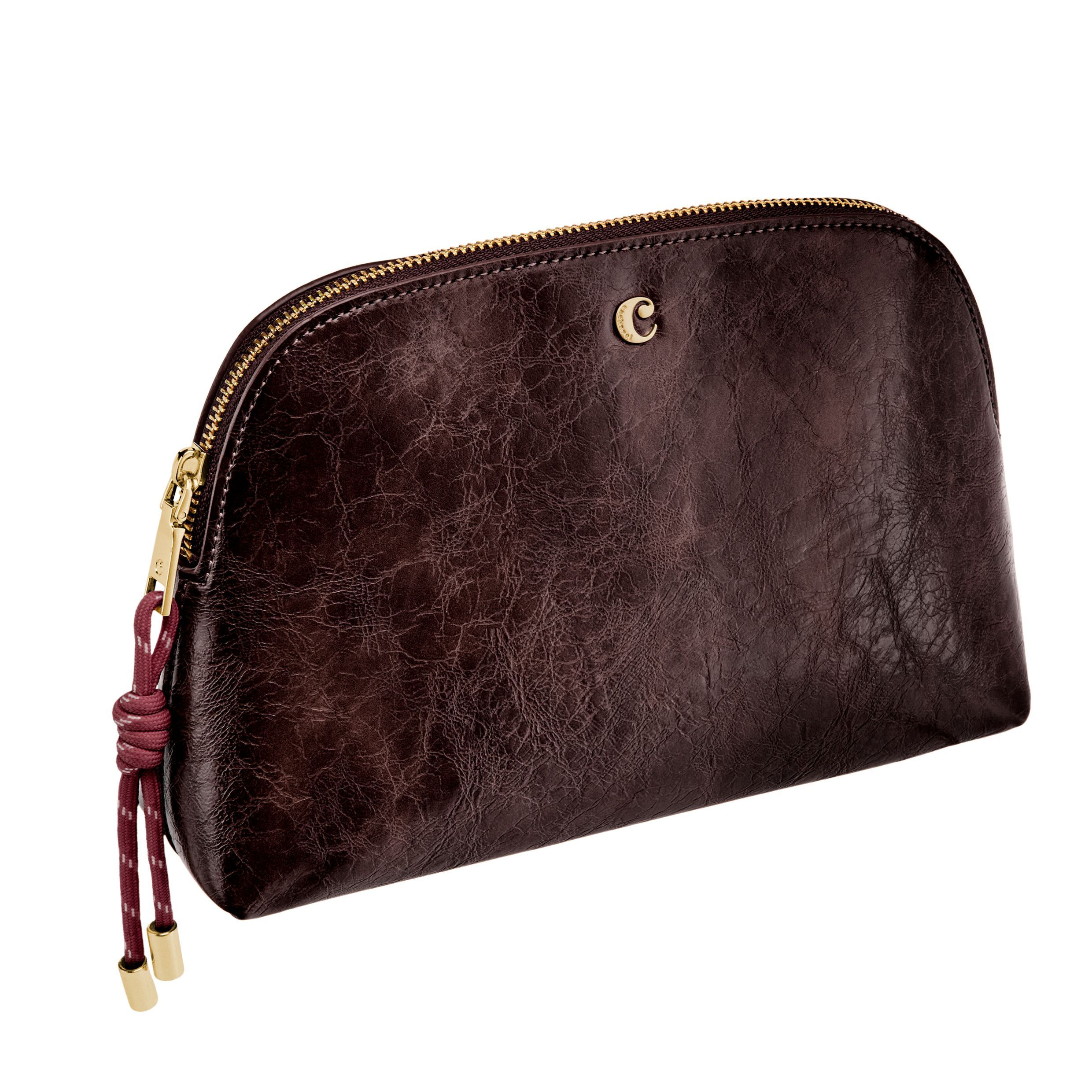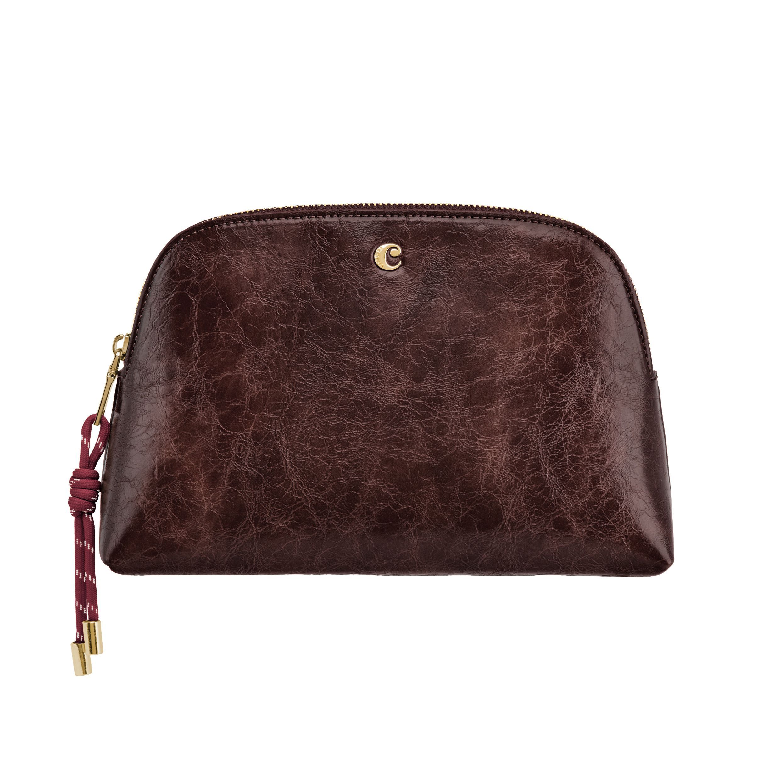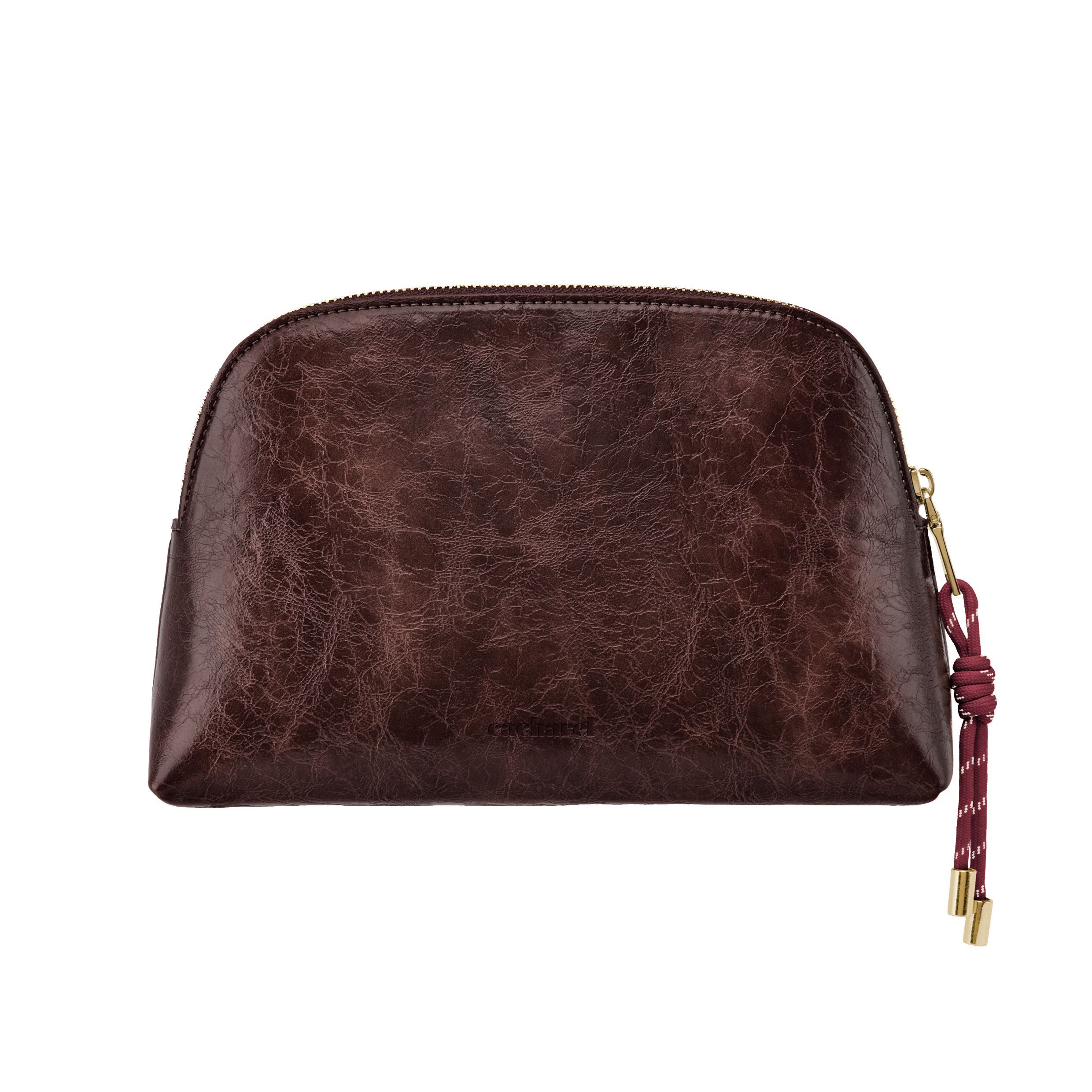 Kosmetyczka Philomene łączy elegancję z odważnym, nowoczesnym charakterem. Wykonana z glazurowanej, marszczonej skóry, sygnowana jest charakterystyczną blaszką Cacharel C i eleganckimi złotymi wykończeniami, tworząc styl, który jest jednocześnie nowoczesny i wyrafinowany. Jej pojemny kształt zapewnia dużo miejsca do przechowywania, dzięki czemu idealnie nadaje się do przechowywania szerokiej gamy kosmetyków lub akcesoriów podróżnych. Całość dopełnia charakterystyczny suwak ze sznurkiem, który dodaje jej modnego charakteru, oraz mała metka Cacharel PU wewnątrz, stanowiąca subtelny, charakterystyczny detal. Dostępna w kolorze czarnym, karmelowym i bordowym.