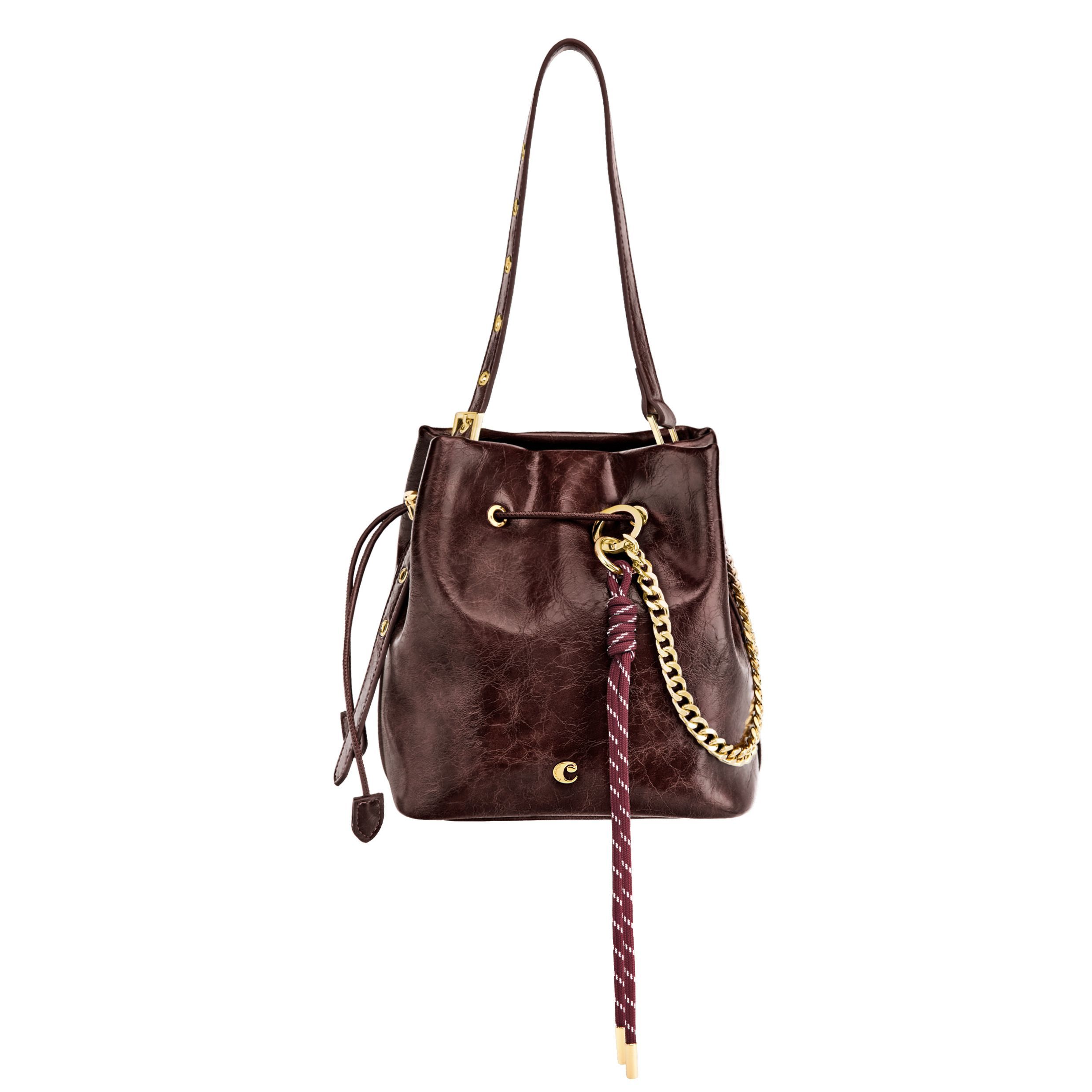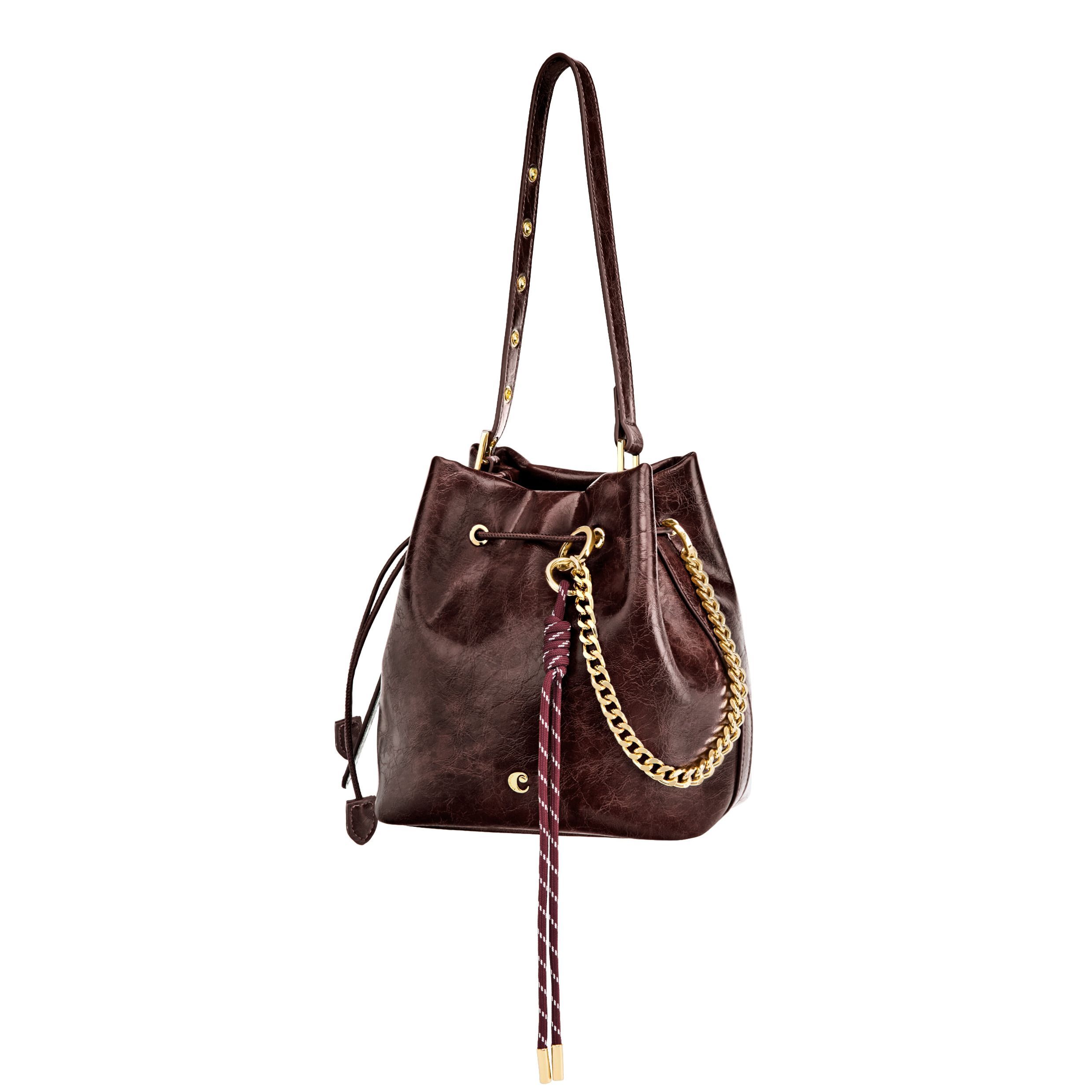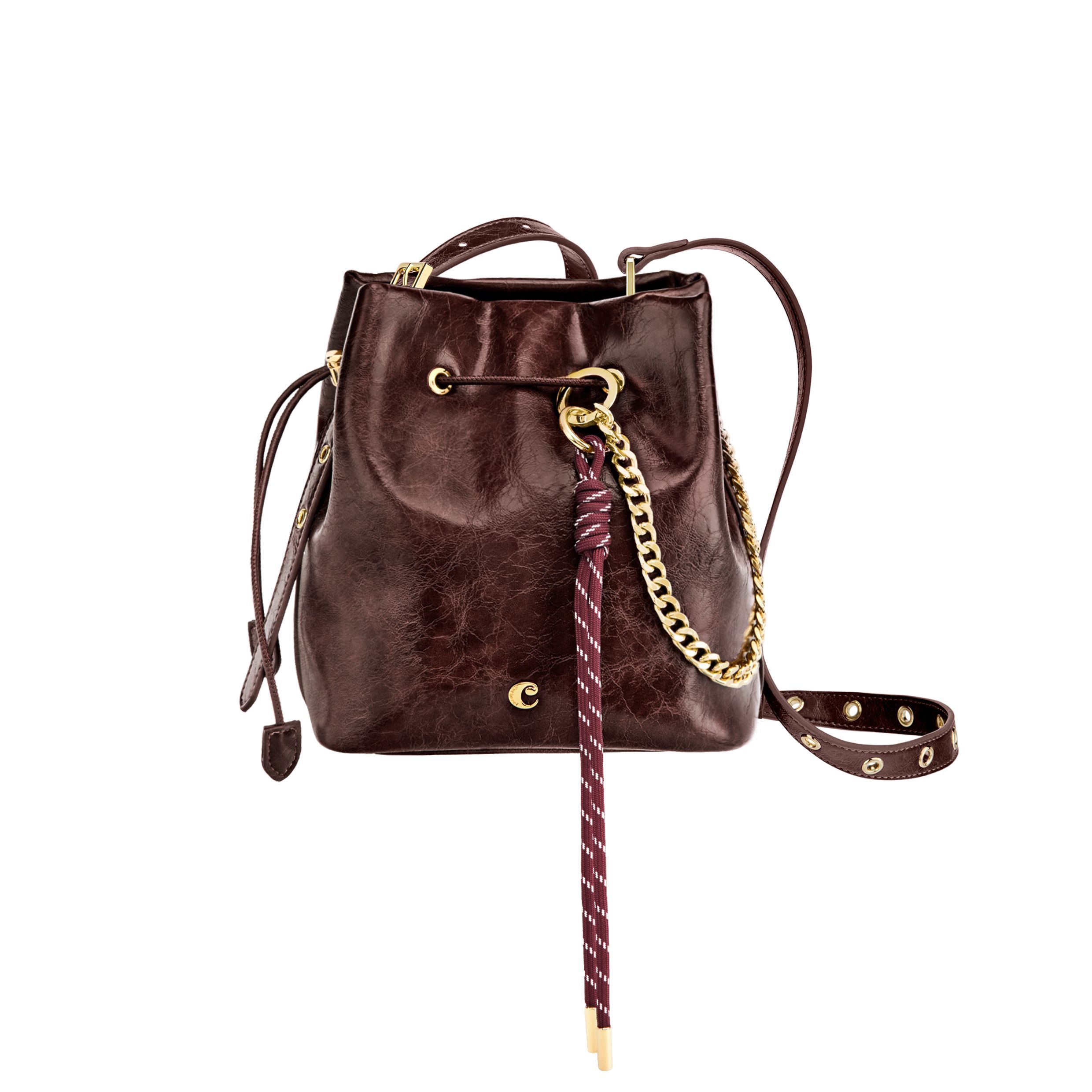 Torebka typu bucket Philomene łączy ponadczasową elegancję z odważnym, awangardowym charakterem. Wykonana z matowej, marszczonej skóry, sygnowana jest charakterystyczną blaszką Cacharel C, ozdobiona eleganckimi złotymi wykończeniami i dyskretnie wytłoczonym logo Cacharel. Materiał jest miękki, elastyczny i niezwykle przyjemny w dotyku. Regulowany pasek umożliwia noszenie jej zarówno w dłoni, jak i na ramieniu, a dodatkowy pasek przekształca ją w torbę typu crossbody. Zapięcie na sznurek z poliuretanu wzmacnia jej kształt przypominający sakiewkę, a odpinana ozdobna zawieszka na sznurku i łańcuszku dodaje jej wyjątkowego, stylowego akcentu. Kompaktowa, a zarazem pojemna, oferuje mnóstwo miejsca na najpotrzebniejsze drobiazgi i posiada kieszeń zapinaną na zamek dla dodatkowej wygody. Dostępna w kolorze czarnym, bordowym i karmelowym.