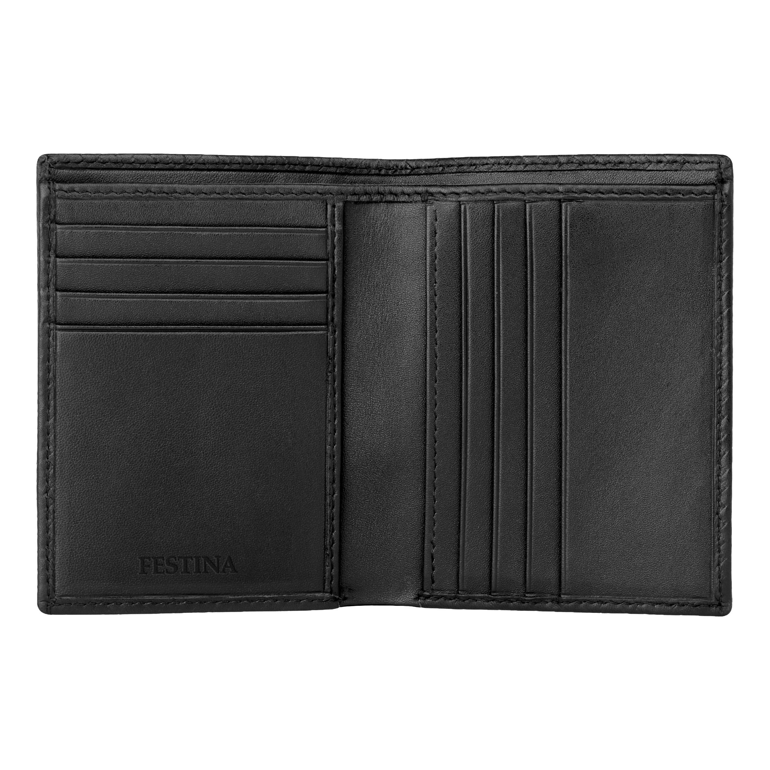 Składany pionowo wizytownik Interlace wykonany jest z wyselekcjonowanej skóry i charakteryzuje się nadrukowanym, plecionym wzorem, który nadaje jego czystej, minimalistycznej sylwetce luksusowy, a zarazem elegancki charakter. Pojedynczy guzik z wygrawerowanym herbem marki dyskretnie podkreśla design, nawiązując do charakterystycznego wzoru, który można znaleźć również na wybranych długopisach, tworząc elegancki zestaw prezentowy. Wewnątrz, wyrafinowany organizer obejmuje przegrodę na notatki podzieloną na dwie części, pięć przegródek na karty, jedną pionową przegródkę po lewej stronie i pięć dodatkowych pionowych przegródek po prawej stronie, a wszystko to uzupełnia luksusowe, a zarazem dyskretne, wytłoczone logo Festina, które dodaje mu ostatecznego akcentu wyrafinowania.