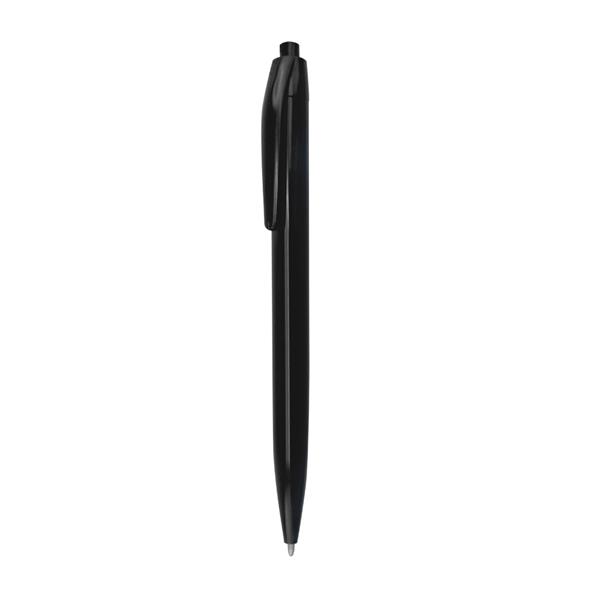 Plastikowy długopis z mechanizmem wciskanym, pisze na czarno.