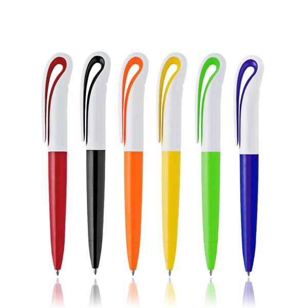 Długopis plastikowy z wygiętym klipsem i mechanizmem obrotowym, pisze na czarno.