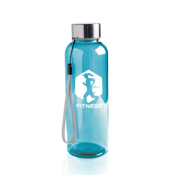Butelka z tritanu, z metalową zakrętką i uchwytem na nadgarstek, pojemność 500 ml. Pakowana w pudełko.