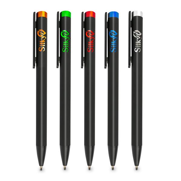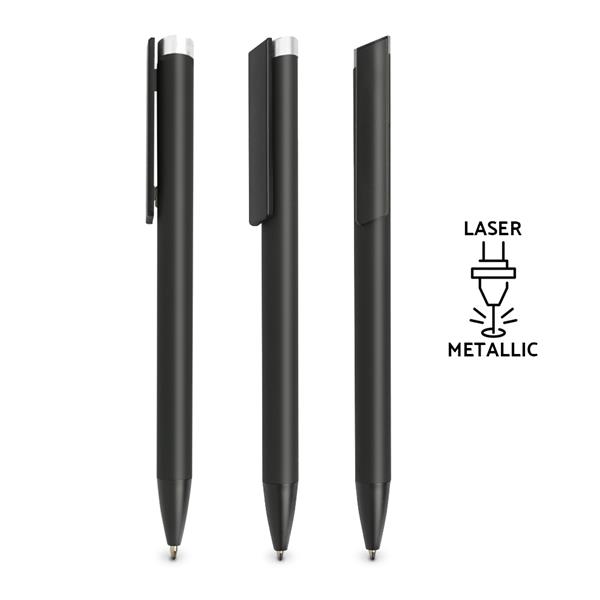 Czarny długopis z mechanizmem wciskanym z gumową, antypoślizgową powłoką, soft touch i kolorową końcówką. Długopis posiada wkład piszący na niebiesko. Grawer wychodzi w kolorze końcówki.