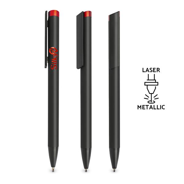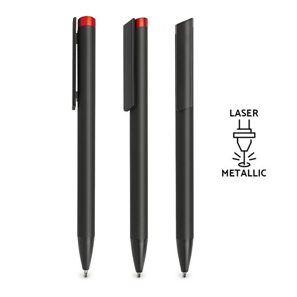 Czarny długopis z mechanizmem wciskanym z gumową, antypoślizgową powłoką, soft touch i kolorową końcówką. Długopis posiada wkład piszący na niebiesko. Grawer wychodzi w kolorze końcówki.