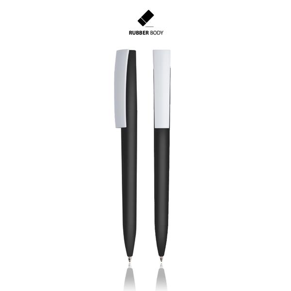 Długopis plastikowy z gumowaną powłoką soft touch, mechanizmem obrotowym oraz dużym klipiem. Pisze na czarno.