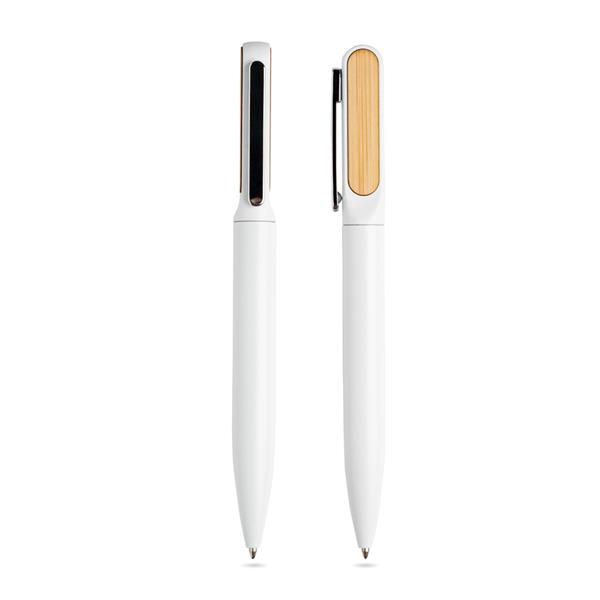 Elegancki metalowy długopis z dwoma bambusowymi elementami, które idealnie nadają się do znakowania laserowego.