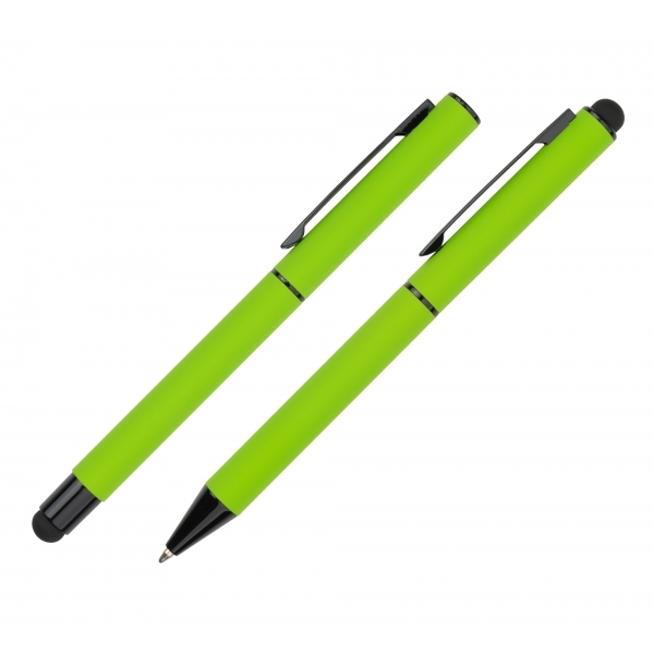 Zestaw piśmienny w modnych, intensywnych kolorach, składający się z długopisu oraz pióra kulkowego. Obydwa artykuły posiadają przyjemną w dotyku powierzchnię soft touch i czarne detale oraz funkcję touch pen. Długopis wyposażony w niebieski wkład (0,7 mm), a pióro kulkowe w niemiecki wkład Schneider piszący na niebiesko (0,5 mm). Całość zapakowana w eleganckie etui prezentowe z certyfikatem autentyczności Pierre Cardin.