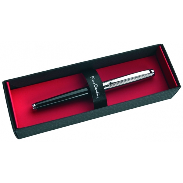 Metalowy długopis z czarnym, lakierowanym korpusem i srebrnymi elementami. Wyposażony w wysokiej jakości niebieski wkład z końcówką 1 mm. W zestawie z wkładem zapasowym piszącym na czarno. Zapakowany w eleganckie pudełko prezentowe z certyfikatem autentyczności Pierre Cardin.