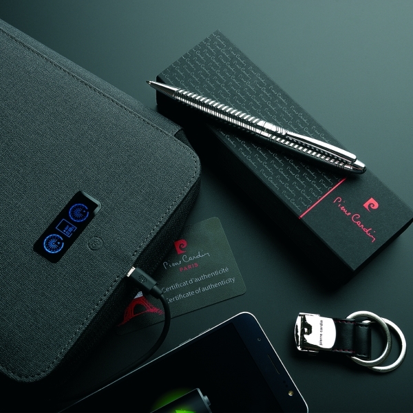 Luksusowy długopis metalowy z charakterystycznym, grawerowanym korpusem i czarnymi elementami. Wyposażony w wysokiej jakości niebieski wkład z końcówką 1 mm. W zestawie z wkładem zapasowym piszącym na czarno. Zapakowany w eleganckie pudełko prezentowe z certyfikatem autentyczności Pierre Cardin.