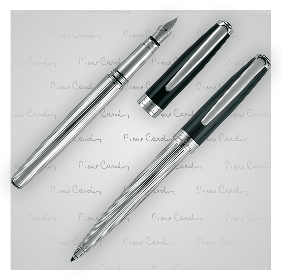 Klasyczny zestaw piśmienny składający się z długopisu i pióra wiecznego. Czarne, lakierowane nasadki idealnie nadają się do grawerowania. Obydwa artykuły posiadają wkłady w standardowych rozmiarach, piszące na niebiesko. Długopis posiada zapasowy, czarny wkład. Całość zapakowana w eleganckie pudełko prezentowe z certyfikatem autentyczności Pierre Cardin.