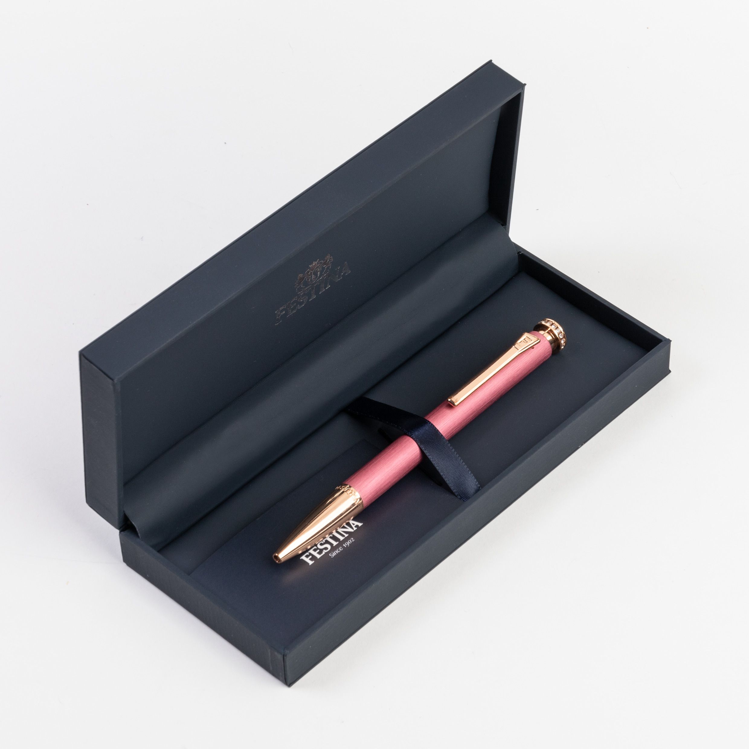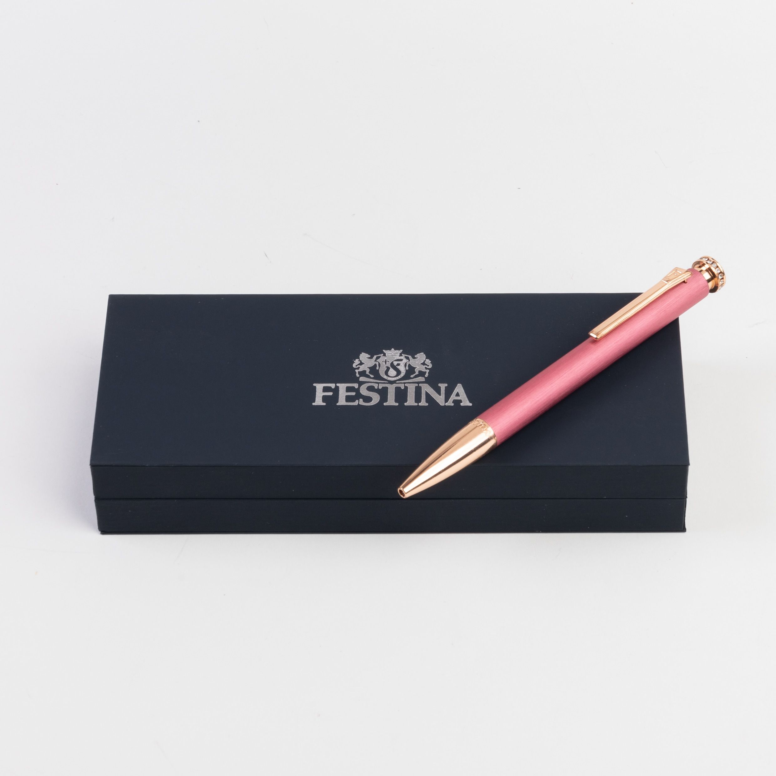 Pióro „Mademoiselle” zostało zaprojektowane z myślą o elegancji i nowoczesnej kobiecości, jednocześnie pozostaje w zgodzie z charakterem marki. Sylwetka pióra jest elegancka i wyważona, a powierzchnia tworzy kontrast między luksusowymi, jasnozłotymi wykończeniami a nowoczesnym polerowanym aluminium. Detale przyborów piśmiennych Festina są oczywiście obecne w charakterystycznym klipsie i logo marki, zdobiącym górę. Pióro jest dostępne w żywej gamie neutralnych tonów i modnych kolorów. Ostatni szlif nadają kryształowe kamienie zdobiące korpus, nadając luksusowy charakter produktowi.