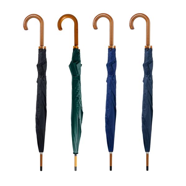 Parasolka automatyczna, wykonana z materiału P-190T, z drewnianą rączką. Klasyczny model z automatycznym otwieraniem, wyposażony w drewnianą rączkę oraz uchwyt w kształcie litery J