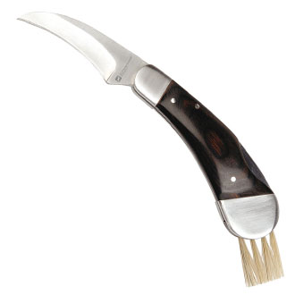 Nóż do zbierania grzybów, wykonany ze stali nierdzewnej i drewna, wyposażony w pędzelek do czyszczenia grzybów.
