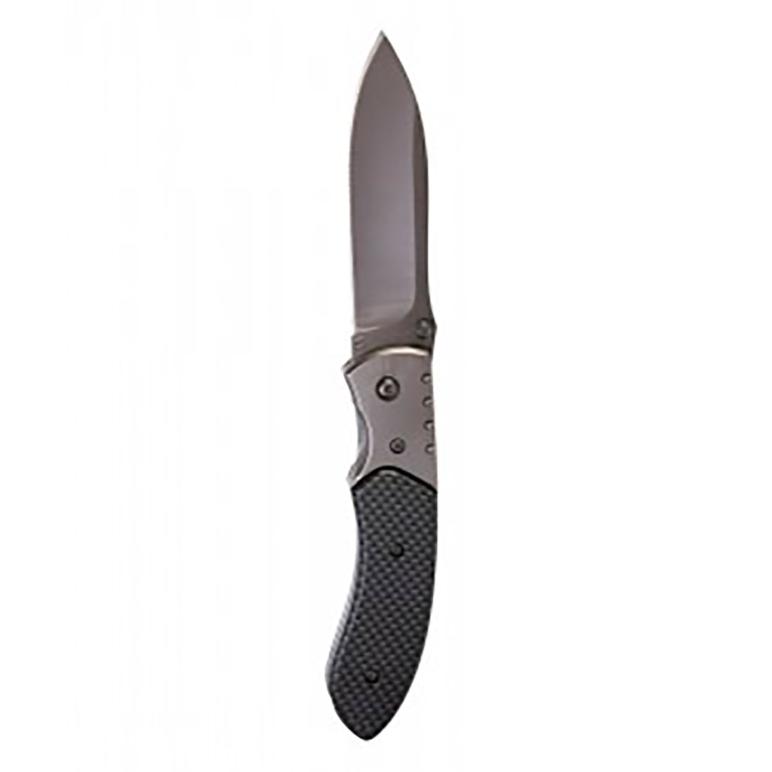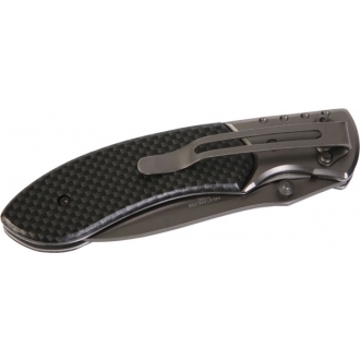 Kieszonkowy nóż ze sprzączką, wykonany z włókna węglowego i metalu.