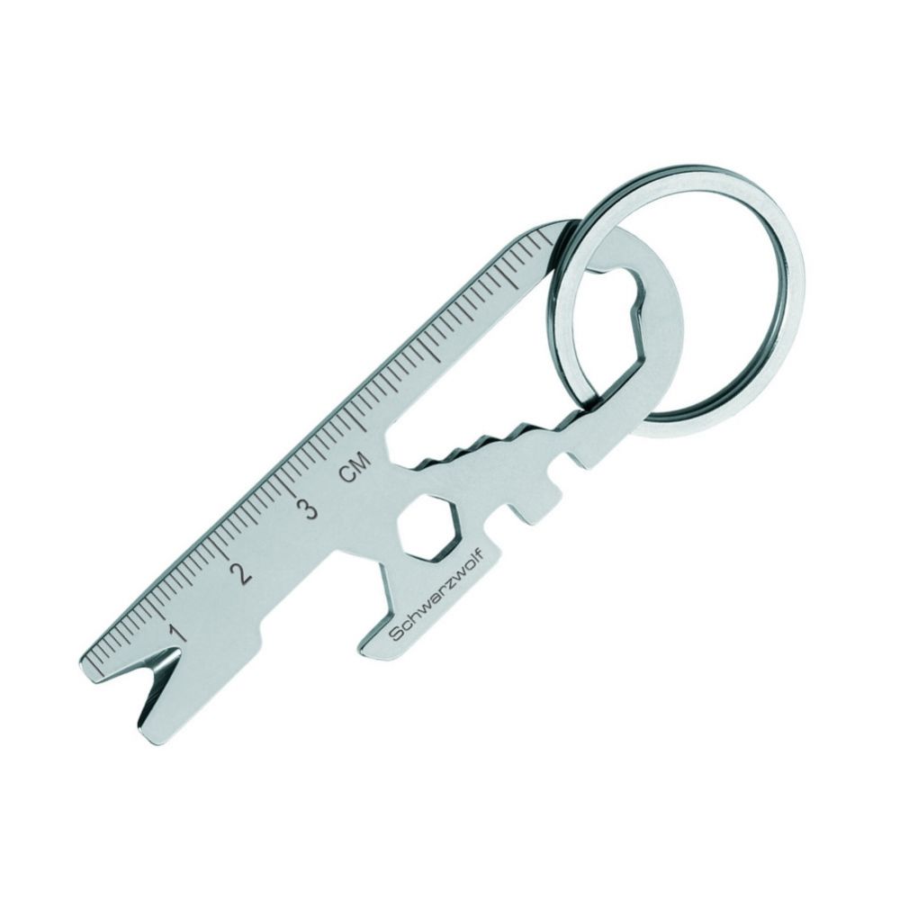 Wielofunkcyjny brelok marki Schwarzwolf zawierający 13 różnych narzędzi, w tym linijkę, magnes, klucz w 6 rozmiarach oraz otwieracz do butelek.