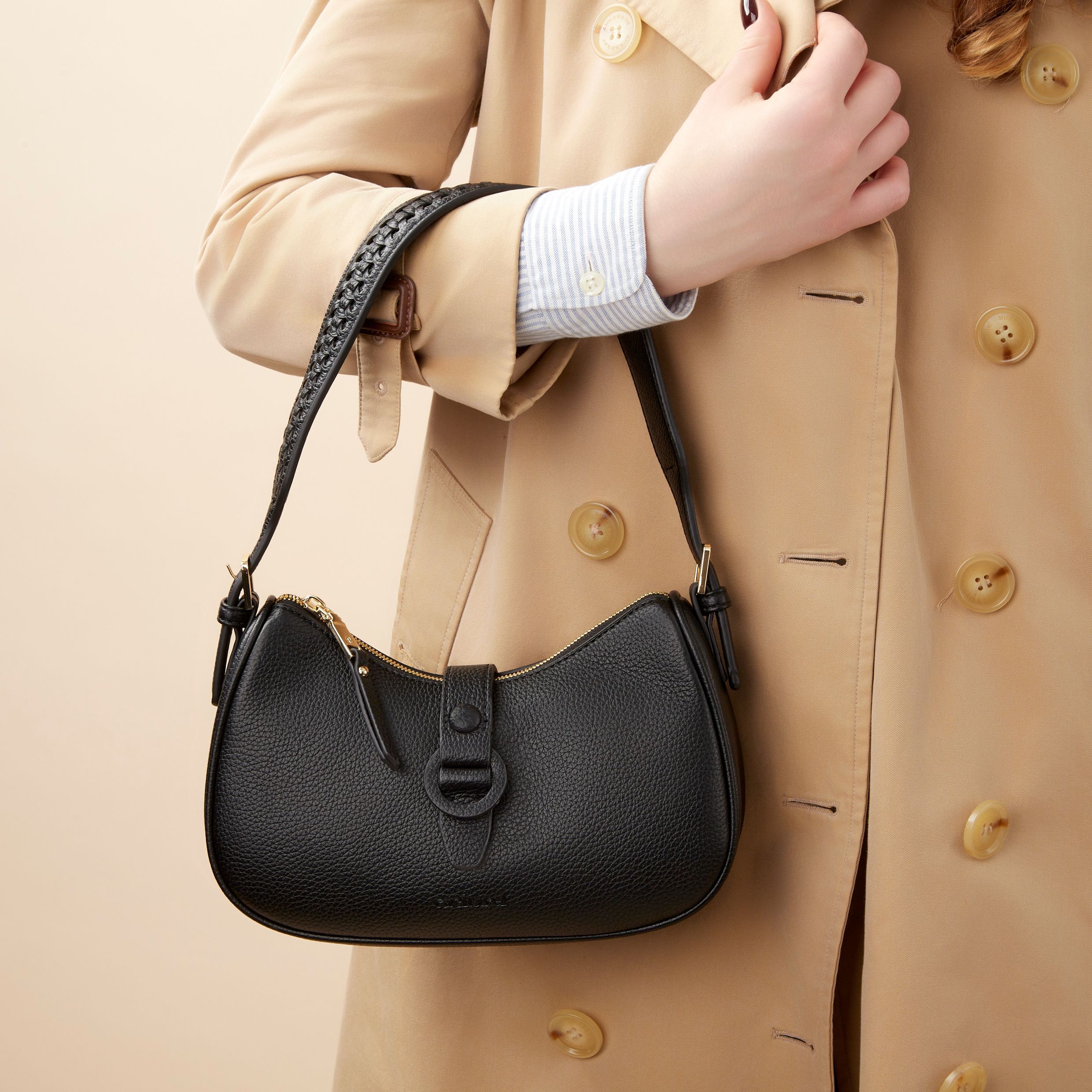 Torba na ramię "Astrid" marki Cacharel uosabia prostotę i praktyczność, dzięki czemu jest idealnym towarzyszem do codziennego użytku. Część funkcjonalnej, stylowej i minimalistycznej linii Astrid, ta kompaktowa torba jest łatwa do przenoszenia i bez wysiłku łączy formę z funkcjonalnością. Wykonana z pięknie ziarnistej skóry wegańskiej z matowym wykończeniem dla odrobiny luksusu, prezentuje drobiazgowe detale, takie jak klamra ton w ton na pasku zamykającym i plecione detale na pasku na ramię. Minimalistyczny podpis jest subtelnie wytłoczony na fakturze, zachowując czystą estetykę. Oferowana w uniwersalnej neutralnej palecie kolorów: czarnym, taupe i ciemnozielonym, torba na ramię Astrid jest uosobieniem subtelnej elegancji.