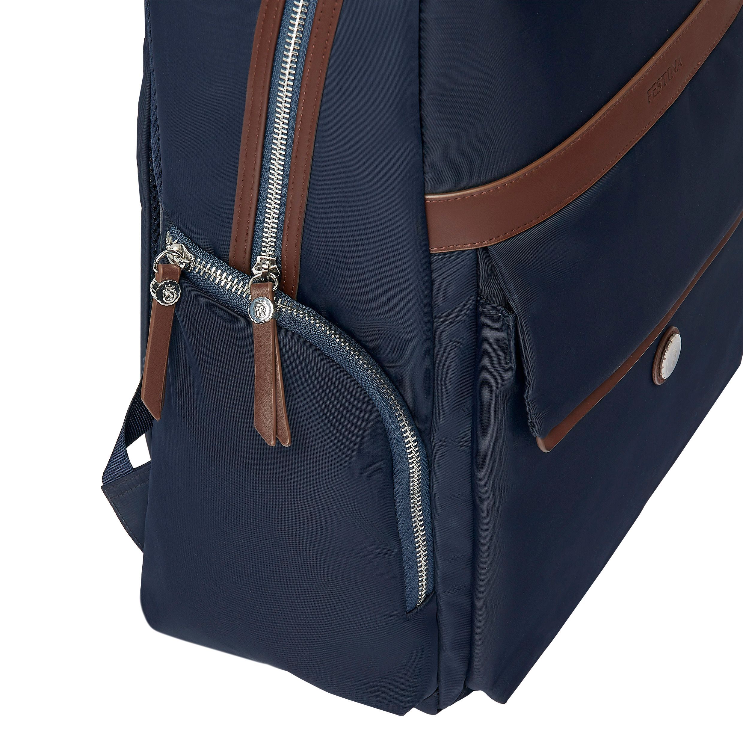Torba "Festina" Button jest wykonana z gładkiego nylonu z teksturowanymi wykończeniami. Ponadgabarytowa płytka marynarki Button została zapożyczona z naszej tytułowej linii małych skórzanych towarów. Wyraziste chromowane akcenty i luksusowe metalowe i luksusowe metalowe detale nadają jej elegancki wygląd, jednocześnie zachowując ogólnie swobodną estetykę. Linia przycisków jest dostępna w dwóch kolorach: jedna wersja jest całkowicie czarna z emaliowaną tabliczką z podpisem, podczas gdy druga wersja łączy granatowy nylon z brązową wegańską skórą i wyrazistymi chromowanymi wykończeniami. Obie wersje charakteryzują się swobodną elegancją i są łatwe do łączenia i dopasowywania. Nasze logo Festina jest delikatnie wytłoczone na każdym produkcie, co stanowi subtelny końcowy akcent. Każdy szczegół jest delikatnie wykonany, w tym suwaki, ozdobione Festina Blazon, a także podszewka Festina z monogramem. Nasze plecaki Button zostały zaprojektowane z myślą o funkcjonalności, lekkie i kompaktowe, a jednocześnie bardzo wyrafinowane, z licznymi przegrodami zapinanymi na suwak, aby uporządkować wszystkie codzienne niezbędne rzeczy. Oprócz przedniej kieszeni i dwóch bocznych kieszeni zapinanych na zamek, wnętrze zawiera dedykowaną sekcję na laptopa. Ergonomiczny, wyściełany tył i regulowane paski zostały opracowane z myślą o doskonałym komforcie użytkowania, nawet przy przenoszeniu cięższych ładunków.