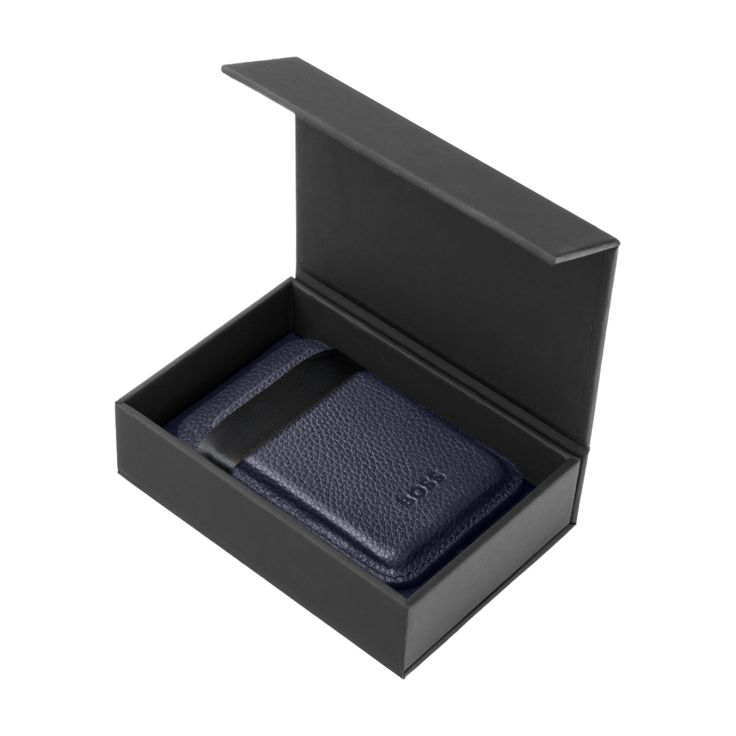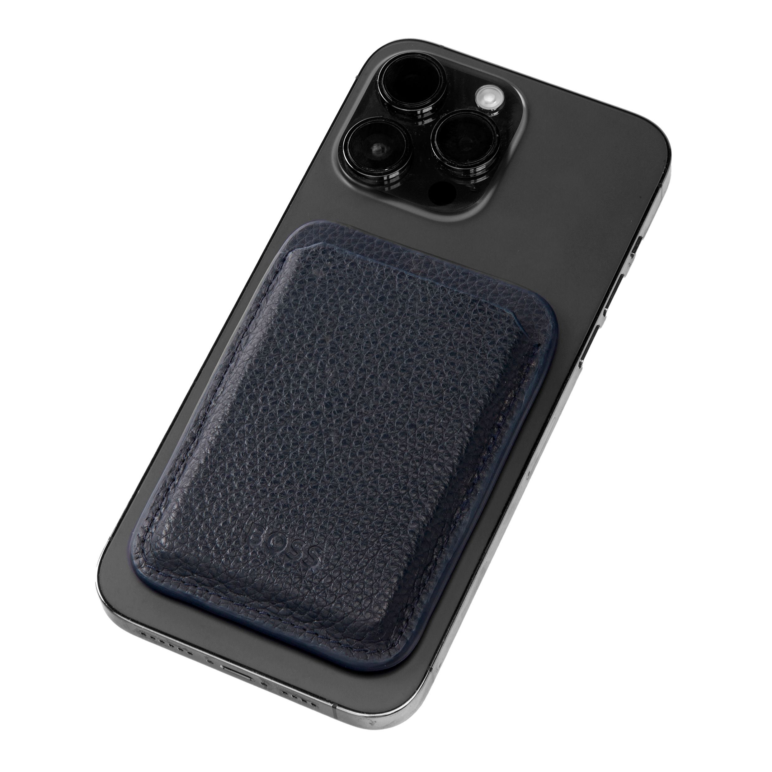 Nasze magnetyczne etui na karty zostało wykonane z najwyższej jakości skóry naturalnej. Jest wyposażony w system MagSafe, który umożliwia przyczepienie z tyłu dowolnego telefonu wyposażonego w tę technologię. Ta granatowa wersja ma piękną matową teksturę z żwirowanym ziarnem i jest subtelnie wytłoczonym logo BOSS. Wykończeniem jest podszewka z monogramem, która dodaje kolejny subtelny element brandingu. Pomimo minimalistycznej i kompaktowej konstrukcji, może pomieścić do 5 kart.