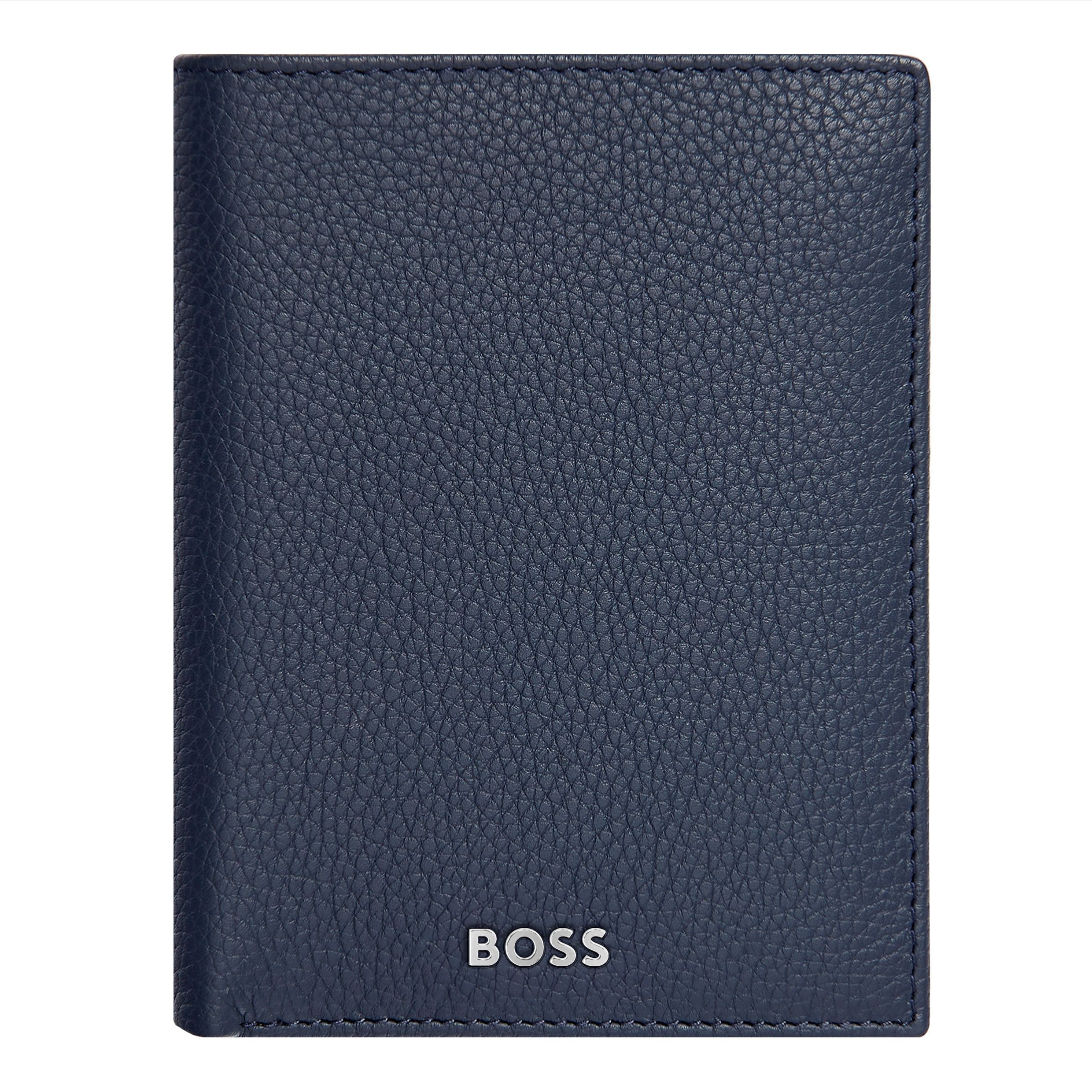 Ten pionowy portfel z klapką i kieszenią na monety jest wykonany ze starannie dobranej, najwyższej jakości granatowej skóry. Jest ozdobiony luksusową chromowaną tabliczką z podpisem BOSS i posiada wewnętrzną podszewkę z monogramem. Portfel zawiera: 2 przegrody na waluty 8 miejsc na karty 5 przegródek bocznych 1 miejsce na monety Zgodnie z DNA marki BOSS, jest prosty, funkcjonalny, elegancki i minimalistyczny.