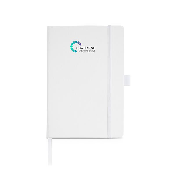 Notes A5 z RPET z gumką na długopis, posiada twardą okładkę 160 białych stron i certyfikat FSC