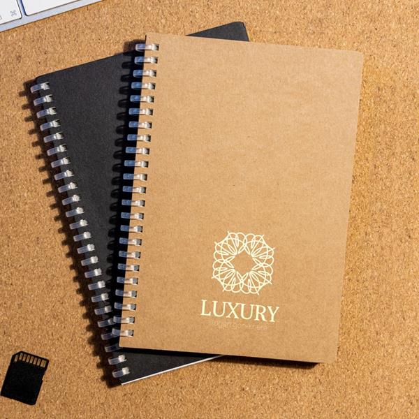 Notes A5 na spirali z miękką okładką kartonową, posiada 136 czystych kremowych stron i certyfikat FSC
