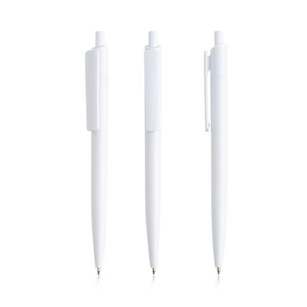 Długopis z recyklingowanego ABS. Recyklingowany długopis o nowoczesnym designie, z szerokim klipsem i jednokolorowym korpusem. Ten długopis z mechanizmem wciskanym pisze na niebiesko. Zobacz także wersję z białym korpusem i kolorowym klipsem, numer 131543.