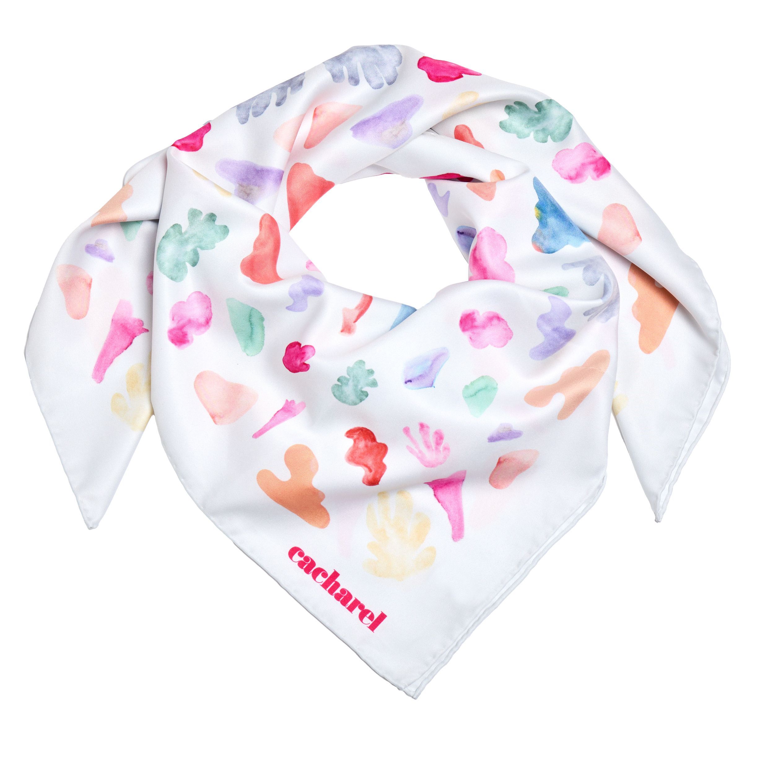Szalik "Apolline" w kolorze złamanej bieli prezentuje miękkie, kolorowe odcienie i organiczne kształty inspirowane płynnymi formami natury. Jego akwarelowy wzór dodaje orzeźwiającego i żywego akcentu do każdego stroju. Wykonana z wegańskiego jedwabiu (poliester twill) apaszka ma wymiary 90 x 90 cm, oferując wszechstronność stylizacji na wiele sposobów.